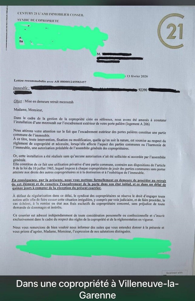 Una famiglia ebraica, residente nella periferia nord di Parigi, ha ricevuto un avviso formale dalla società di gestione del suo condominio, che intimava di rimuovere la mezuzah affissa allo stipite della porta del suo appartamento: pena un’azione legale.