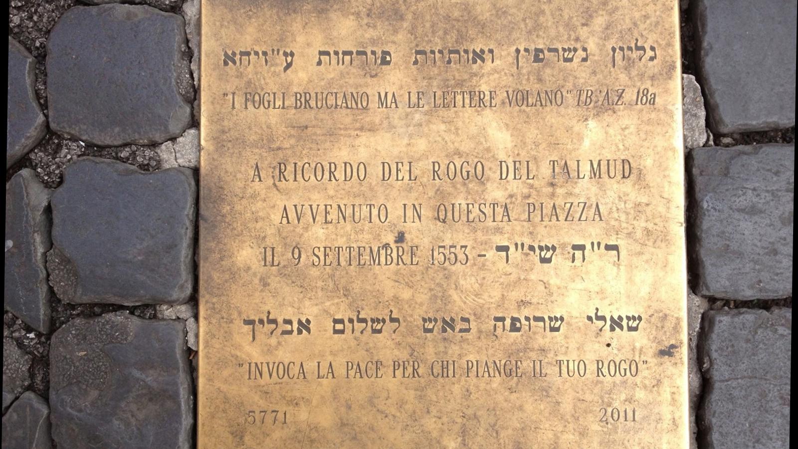 Nell’immagine: la targa a Campo de’ Fiori in ricordo del rogo del Talmud del 1553, con su scritto “I fogli bruciano ma le lettere volano”