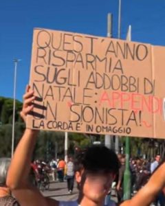 Ma il peggio deve ancora arrivare. Un cartello inneggia a tempi bui: “Quest’anno risparmia sugli addobbi di Natale, appendi un sionista, la corda è in omaggio”. Del resto, di cosa ci meravigliamo quando bambini indottrinati cantano “From the river to the sea” ricordando tanto i piccoli Balilla che sfilavano nel sabato fascista? Come diventa normale urlare in un corteo: “Morte all’Idf”, scritto su un grande stendardo sventolato lungo tutto il percorso.